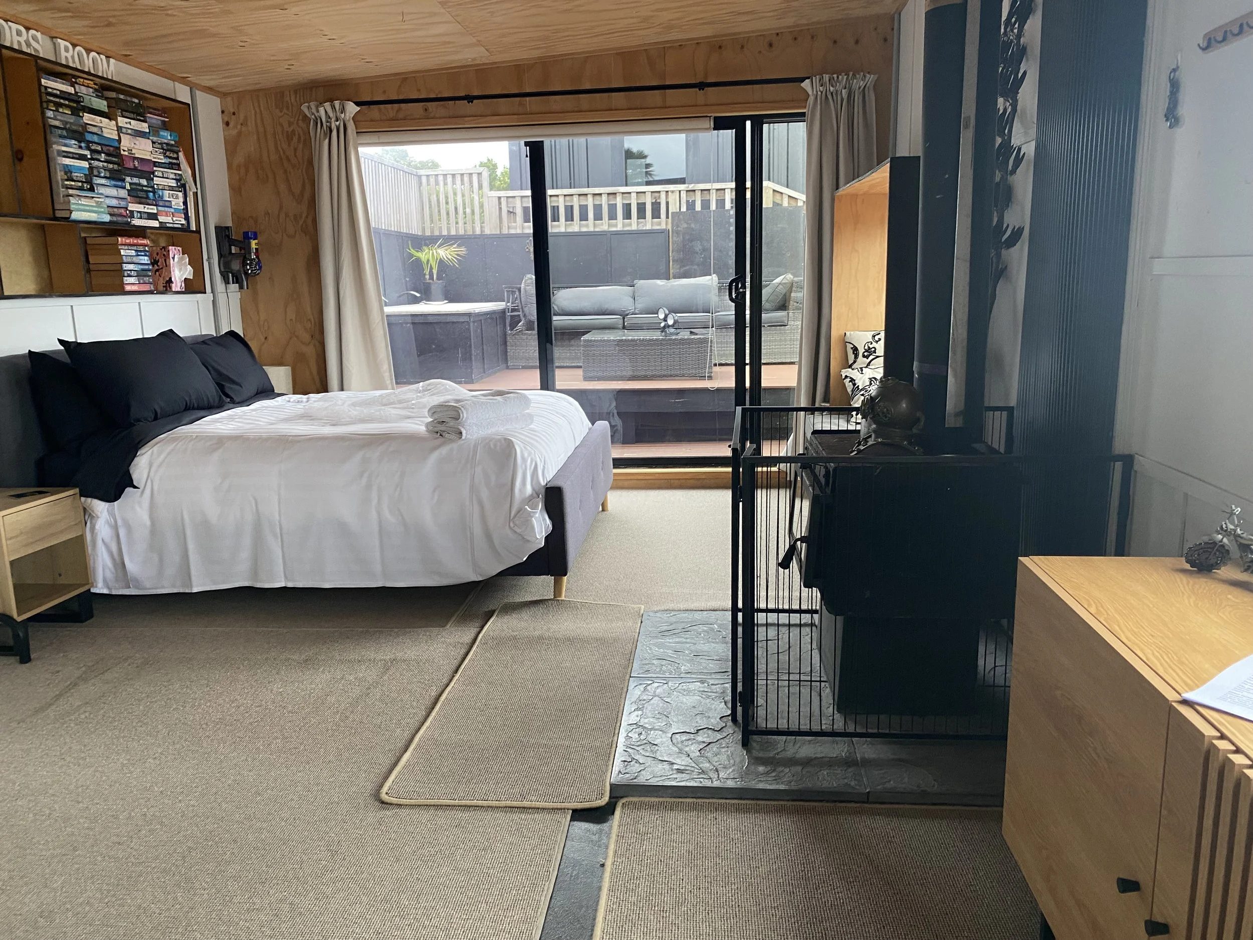The cabin is a unique room with memorabilia of riding and diving with a Queensize bed, a comfortable Eco couch (for an extra bed) and cozy potbelly for those winter evenings. Whilst the outside shower and bath are available, it also has a small ensuite. The outside kitchen provides basic cooking facilities with a fullsize fridge. On the deck outside the Cabin and the Nest is a large macrocarpa table we refer to as “the Game of Thrones table”.